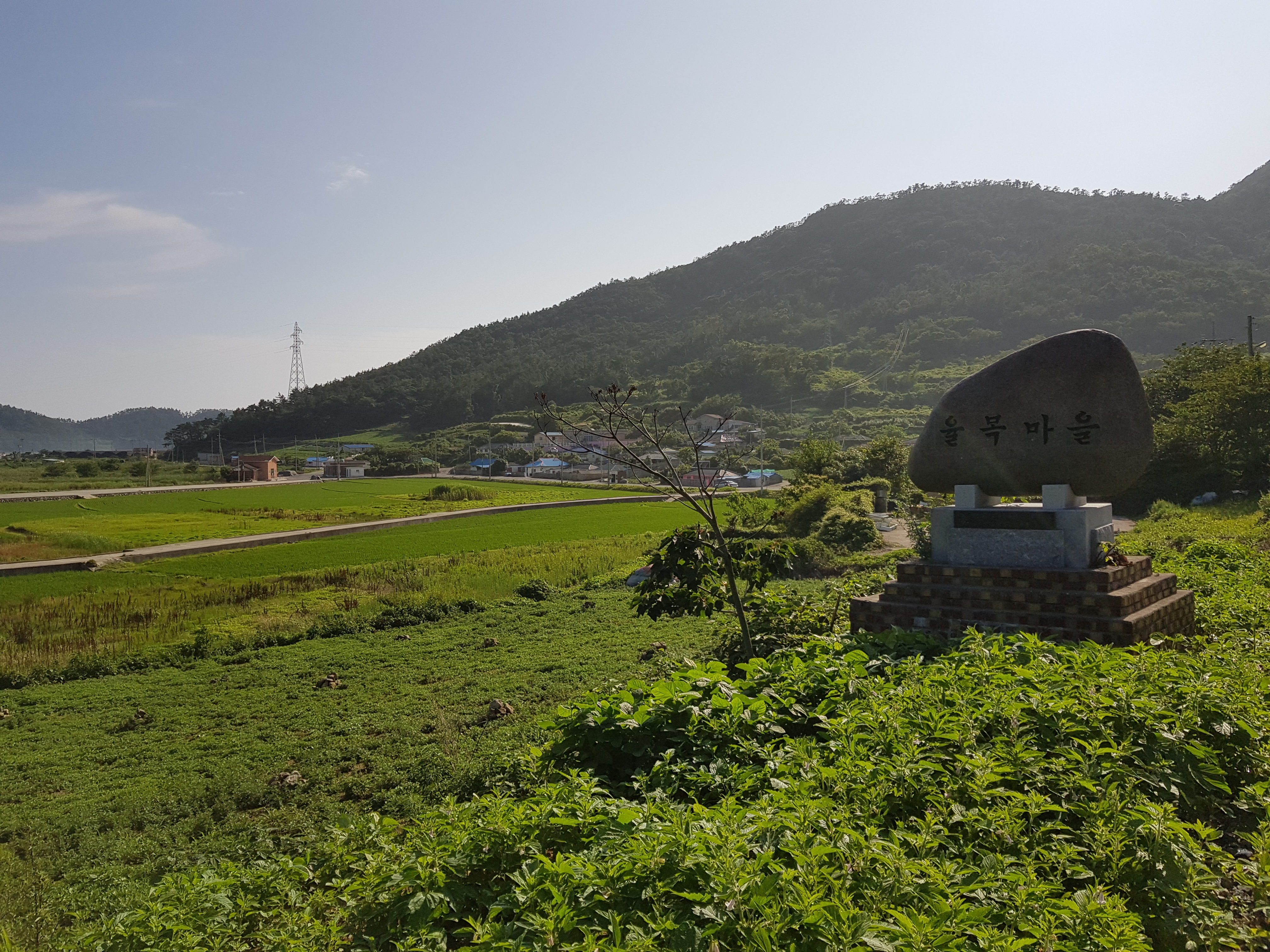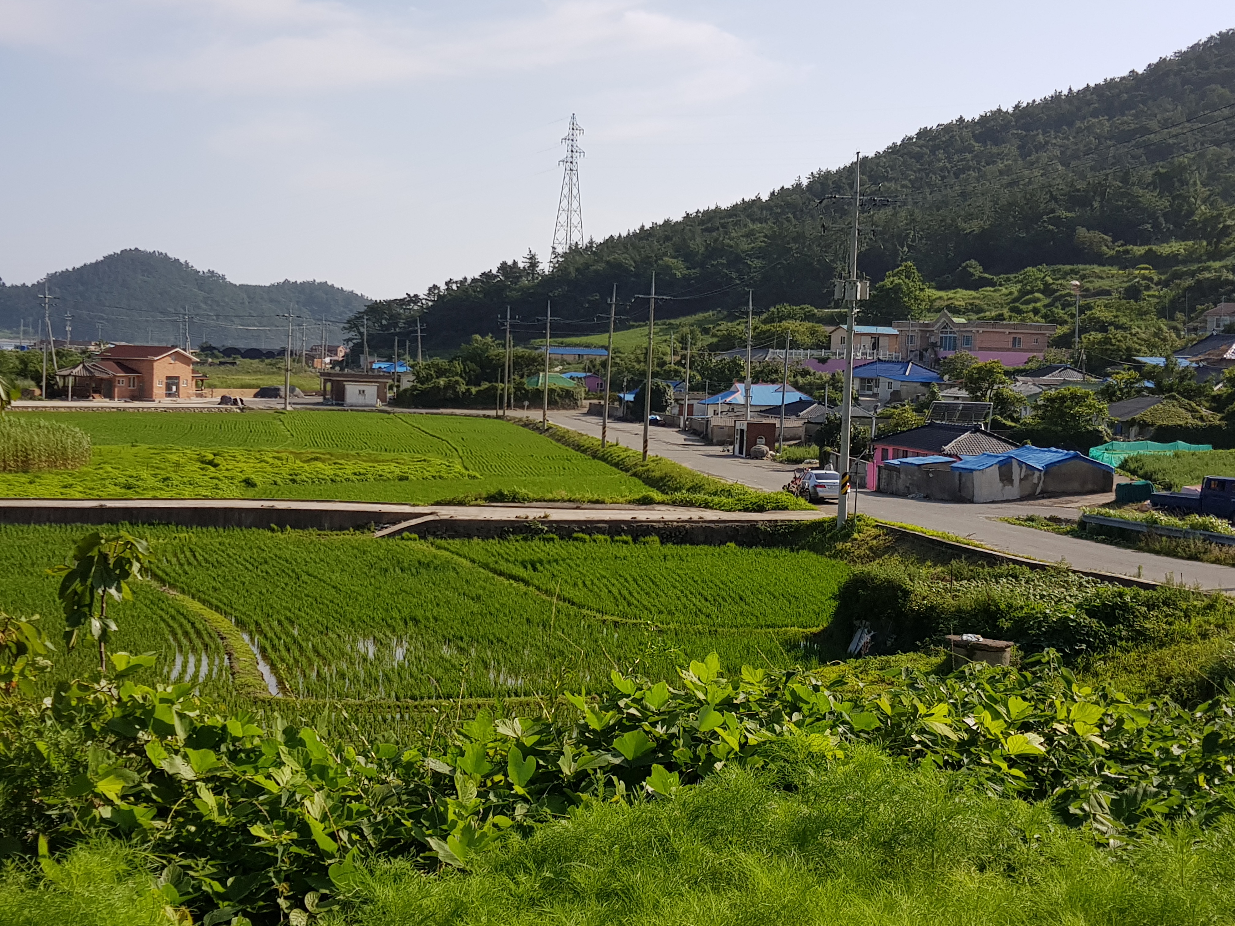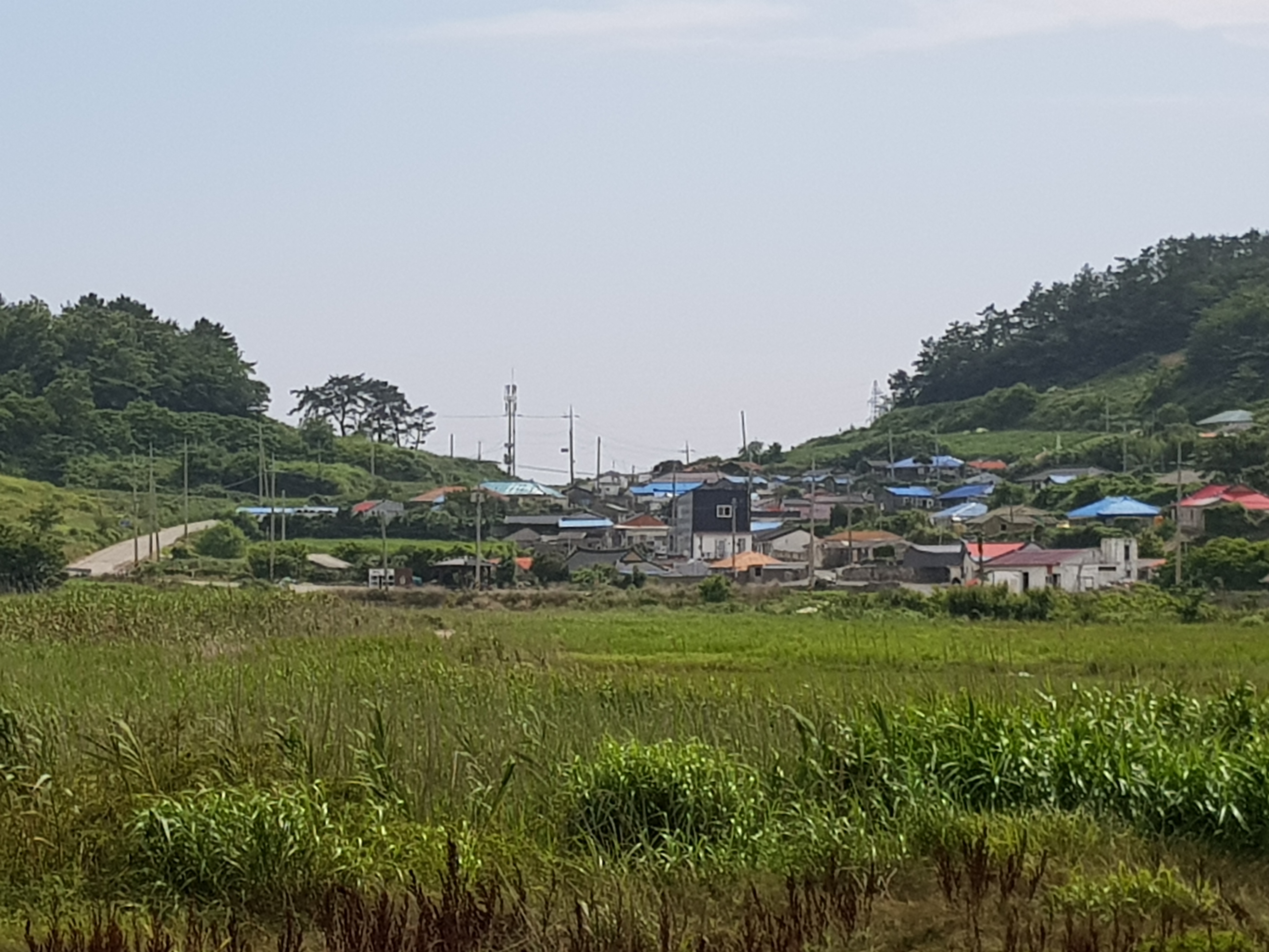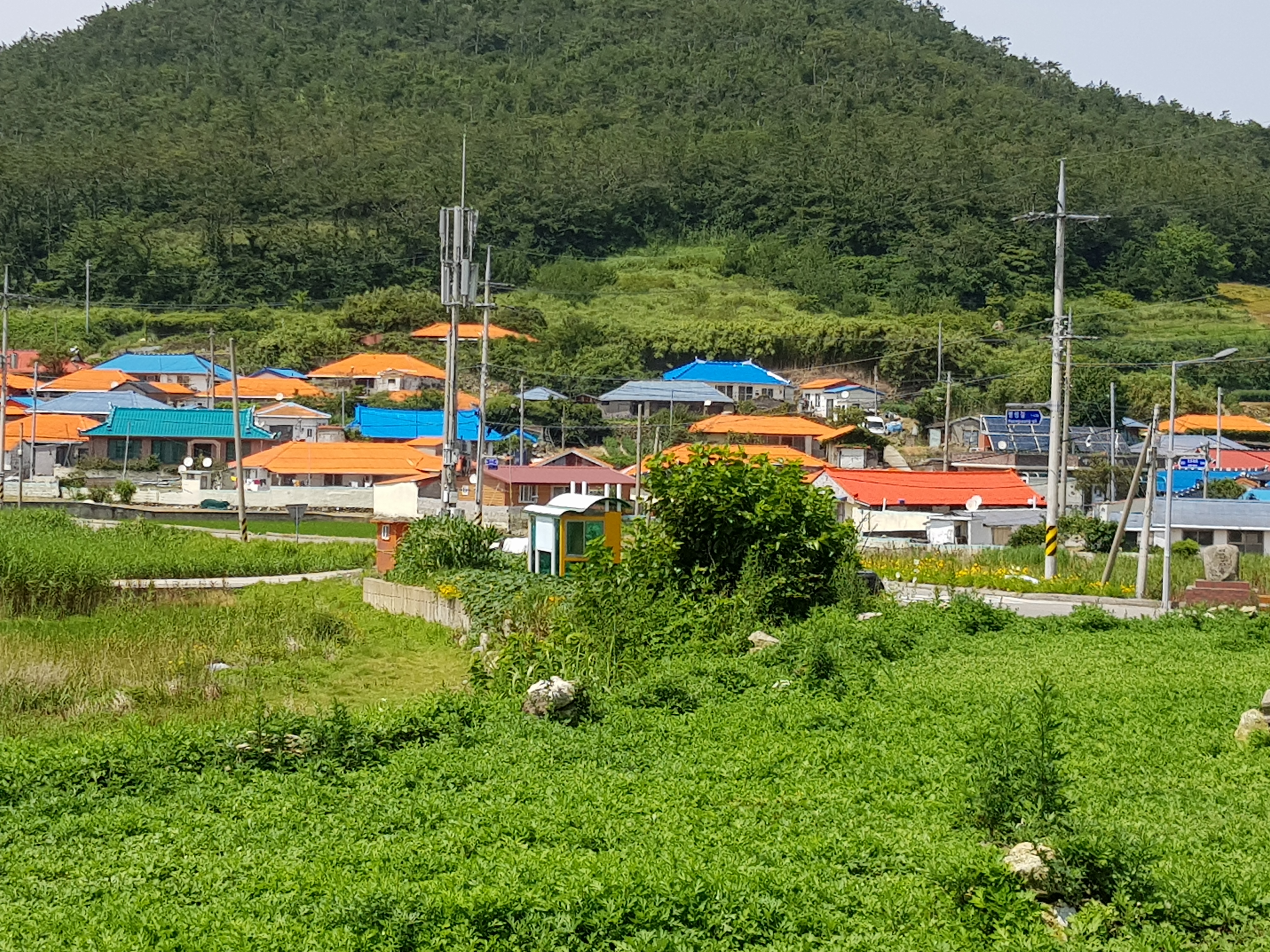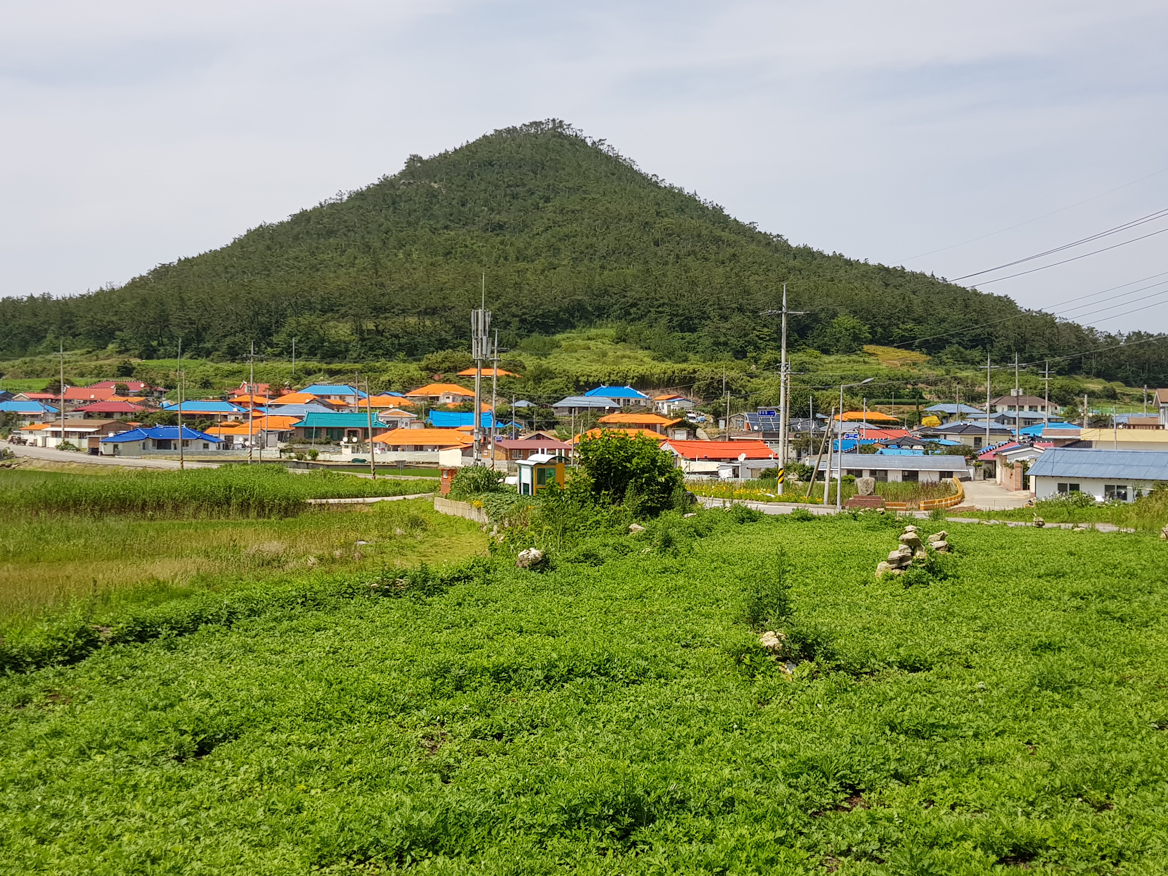 14시 30분. 상조도 맹성리. 삼각 모양의 산과 그 아래 마을