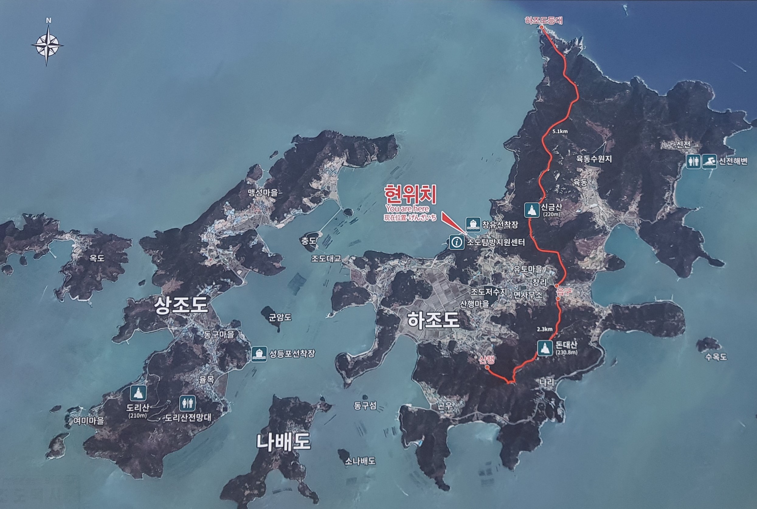 앞에서부터 상조도, ㄱ자 길, 충도, 조도대교, 끝으로 하조도